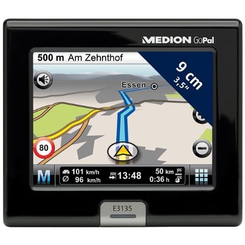 - MEDION GoPal E3135 8,89 cm/3,5" Navigationssystem ° Hauptmerkmale: Grenzübergreifende Navigation innerhalb von Deutschland, Österreich und der Schweiz (Kartenmaterial komplett vorinstalliert) ° Kompaktes Design mit einem 8,89 cm/3,5'' TFT-Touchscreen Display ° Text-to-Speech - für besonders präzise Fahranweisungen ° SiRFstarIII mit SiRFInstantFixII - für sekundenschnelle Positionsbestimmung und Routenberechnung